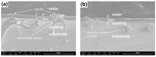 Figure 5 shows the cross-sectional morphologies of the coated samples. Both coatings were well bonded to the substrate, free of micro-cracks at the substrate/coating interface. Clearly, SS-coating is about 5 μm thick, obviously thinner than the cast-coating (about 8 μm). Note that the coating on the α-Mg matrix takes most part of the coating, the much thinner SS-coating should have a relationship with the microstructure and chemical composition of its α-Mg phase. Beside the coating thickness, differences can also be found in the coating compactness. Cracks can be easily found in the cast-coating, particularly above the secondary phases of the substrate alloy, which were marked by the white arrows in the Figure 5a. In contrast, besides the thinner coating covered on the secondary-phase particles, the SS-coating is much compacter in the cross-sectional view.
