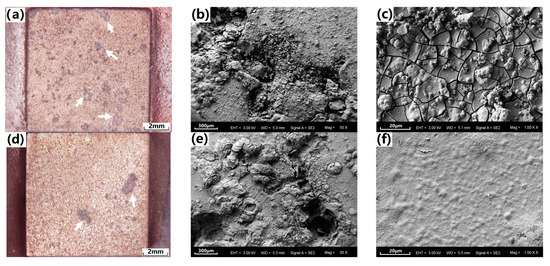 Figure 7 presents the optical and SEM corrosion morphologies of the coated samples after hydrogen-evolution immersion in Hanks’ solution for five days. As seen in Figure 7a,b, both samples present typical localized corrosion morphologies under optical micrographs. Given the number and size of the corrosion spots (as marked by the white arrows), the corrosion damage of the SS-coated sample was clearly less than that of the cast-coated sample. As seen in Figure 7b,e, the SEM morphologies of the corrosion spots in the two samples showed similar corrosion damage in both the coating layer and the substrate alloys. The corrosion spots were covered by the loose corrosion production, and the corrosion damage has propagated in the depth direction of the substrate. However, a great difference can be found in the non-serious corroded zone of the coating via SEM, which is shown in Figure 7c,f. The cast-coating has been seriously cracked while the SS-coating still kept integrated, no cracks can be found. The mass of cracks on the cast-coated sample provided channels for the direct penetration of the corrosive medium. In contrast, the SS-coating can still provide sufficient prevention due to the better integrity and compactness of the coating.