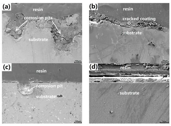 SEM cross-sectional corrosion morphologies of the coated samples after hydrogen-evolution immersion in Hanks’ solution for five days. (a,b) are the cast-coated sample; (c,d) are the SS-coated sample.