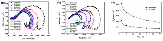 Electrochemical impendence spectroscopy (EIS) characteristic parameters of the coated samples. (a,b) are the EIS Nyquist plots of the cast-coated and SS-coated samples respectively; (c) is the fitted Rp value curves respectively.