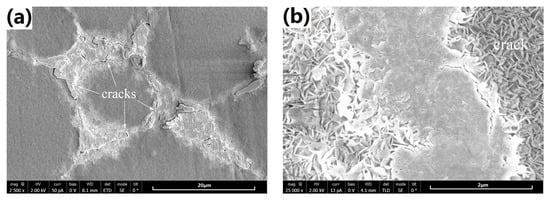 For better understanding the effect of SS-treatment on the coating formation, a 1-h synthesized coating was carefully examined by SEM, as shown in Figure 11. Clearly, as for the cast-coated sample, the coatings on the α-Mg phase and the secondary phase present extremely different stacking structures of Mg(OH)2 crystal units. In addition, micro cracks are frequently observed along the boundary of the α-Mg phase and secondary phase, which may be caused by the different volume shrinkage ratio of both phases of the coating during the drying processing after hydrothermal synthesizing. However, just as the SS-coated sample, the coatings present the similar stacking structure of Mg(OH)2 crystal units on the α-Mg phase and the secondary phase. Importantly, no micro cracks can be found. This phenomenon may have a close relationship to the homogenization process during SS treatment. Bear in mind that the composition difference of two phases was reduced of the SS-treated substrate, as shown in Figure 2. This may lead to the similar shrinkage behavior during drying. Also, relatively lower Mg and higher alloying concentrations probably give rise to a thinner coating eventually on the SS-treated substrate.
