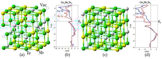 Why such huge amount of vacancies can be present in GST crystals? This question was answered by Density Functional Theory (DFT) simulations [46,47,48] and quantum chemistry bonding analysis [49]. In Ref. [45], a hypothetical rocksalt Ge2Sb2Te4 alloy was modeled, as shown in Figure 1c. The formation energy of atomic vacancies is negative, ~−0.5 eV, indicating that the system is stabilized upon forming vacancies. This is in striking difference with silicon, where the formation of vacancies is quite unfavorable, 3.3 eV [50]. The crystal orbital Hamilton population (COHP) bonding analysis [49,51,52,53] provides a deeper understanding of this unconventional behavior in GST crystals. This method dissects the electronic structure into bonding and antibonding interactions. A high antibonding contribution at the Fermi level EF indicates that the system has chemical instability. In certain cases, such unfavorable interaction would result in a complete collapse of the crystal lattice [54,55]. The comparison between rocksalt Ge1Sb2Te4 and Ge2Sb2Te4 is shown in Figure 1b,d. Significant antibonding interactions (–COHP < 0) are present at the EF of Ge2Sb2Te4, which are completely removed when 12.5% Ge atoms are made into vacancies. This is because removing the Ge atoms decreases the number of electrons, thus pushing the EF downward, away from the unfavorable bonding region. Although some antibonding interactions remain in Ge1Sb2Te4 right below the EF, they do not affect the stability of the compound significantly. In fact, this behavior is constantly observed in phase change materials, such as other GST compounds and their binary parent compounds, GeTe [56,57] and Sb2Te3 [58].