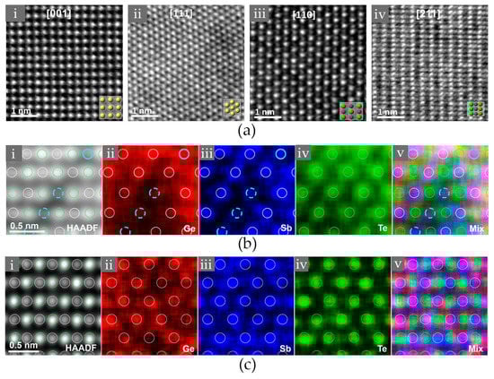 Figure 2. (a) The high angle annular dark field scanning transmission electron microscopy (HAADF-STEM) images of Ge2Sb2Te5 along the [001], [111], [110], and [211] crystallographic orientations. Insert in the bottom right corner of each image is the arrangement obtained from the ideal atomic model. Yellow color indicates that the atomic column includes both cation-like and anion-like atoms, while pink and green indicate the cation-like and anion-like sublattices, respectively. (b,c) The EDX chemical mappings of rocksalt Ge2Sb2Te5 along the [110] direction with Ge, Sb and Te being marked in red, blue and green, respectively. The mixture of these mappings is also shown. (b,c) Are taken from the different parts of the same sample. Adapted with permission from Reference [42]. © 2016 American Institute of Physics.