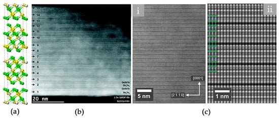 Figure 3. (a) The atomic model of hexagonal Ge1Sb2Te4. Chemical disorder is included for the cationic-like layers. Ge, Sb and Te atoms are rendered with grey, yellow and green spheres, respectively; (b) The HAADF-STEM image of hexagonal Ge1Sb2Te4, which was obtained by annealing a molecular beam epitaxy (MBE) grown sample at 400 °C for 30 min; (c) The HAADF-STEM images of hexagonal Ge1Sb2Te4, which was produced by metal organic vapor phase epitaxy (MOVPE) method with a growth temperature above 400 °C. The brighter dots indicate Te atomic columns, whereas darker dots are Ge/Sb atomic columns. Adapted with permission from References [66,67] © 2015 The Royal Society of Chemistry; 2016 Elsevier Ltd.