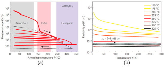 Figure 4. (a) Temperature dependence of the sheet resistance measured in a 100-nm-thick Ge1Sb2Te4 film. The samples were heated up quickly and annealed at different temperatures for 30 min, then were cooled down to room temperature; (b) Low-temperature transport measurement of Ge1Sb2Te4 thin films. The lowest temperature reached 5 K. Different colors of curves in (b) represent eight samples annealed in the range between 150 °C and 325 °C. Adapted with permission from Reference [12] © 2011 Nature Publishing Group.