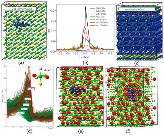 The Kohn–Sham eigenstates close to the Fermi level were analyzed, and a key parameter that characterizes the degree of localization, the Inverse Participation Ratio (IPR), was computed for these electronic states. Finite IPRs indicate that the electronic states are localized, while the IPRs of extended states are close to zero for sufficiently large system sizes. For models with ~1000 atoms, the IPRs of extended states are of the order of 10−3, and such value should fully vanish when the system becomes infinitely large. In Figure 5b, the IPRs of the electronic states of disordered rocksalt GST at the Fermi level are an order of magnitude larger than 10−3, revealing them to be localized states. These IPRs correspond to a group of ~25–60 atoms, giving a localization length ~10 Å, in line with that obtained from transport experiments. The highest occupied molecular orbital (HOMO) state of the most disordered rocksalt GST is plotted in Figure 5a. The electron wave function is found to be very well localized in the upper side of the model (blue spheres). A detailed structural analysis showed that the concentration of atomic vacancies in this region was quite high, almost twice larger than the average value. The atomic vacancies are highlighted with bigger red balls in Figure 5e. The higher vacancy concentration in this region corresponds to several Te atoms with 2–4 vacant neighbors, and was denoted as “vacancy cluster” in Ref. [15]. It needs to be stressed that “vacancy clusters” are not voids, as many atoms are present inside this region. To verify this claim, a rocksalt GST model with a manually arranged “vacancy cluster” was generated and computed, and the electron wave function of the HOMO state appeared in this vacancy-rich region as expected. A thorough analysis of the local density of states (LDOS) of Te atoms according to their nearest-neighbor configuration further confirmed the essential role of atomic vacancies in localizing electrons. As shown in Figure 5d, a pronounced increase of LDOS as a function of the nearest-neighbor vacant sites nVac of Te atoms can be observed. It is noted that this analysis was carried out on unrelaxed structures of rocksalt GST (up to 4096 lattice sites, 16 × 16 × 16 supercell ~5 × 5 × 5 nm3). Relaxed models show similar trends. Therefore, we can conclude that atomic displacements are not important to the electron localization in GST.