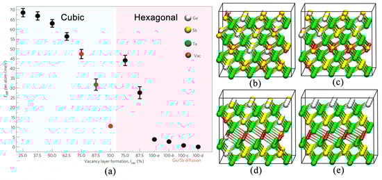 Figure 6. (a) The energy trend of Ge1Sb2Te4 with the reduction of disorder and the formation of vacancy layers. The atomic vacancies migrate from cation-like layers to some specific cation-like layers (3 out of 24 atomic layers in a rocksalt Ge1Sb2Te4 supercell model). The vacancy concentration on these layers increases from 25 to 100%. The red point at 100% in the cubic region indicates the ordered cubic phase with fully formed “vacancy layers”. Chemical Ge/Sb disorder on the cation-like layers is included; (be) The atomic structure of cubic and hexagonal GST models: (b) Cub-25% (c) Cub-50% (d) Hex-75% (e) Hex-100%-d. The four hexagonal models differ in the degree of chemical Ge/Sb disorder on the cation-like layers. Small red spheres indicate vacancies. Only parts of full models are shown, for the sake of clarity. Adapted with permission from Reference [15] © 2012 Nature Publishing Group.