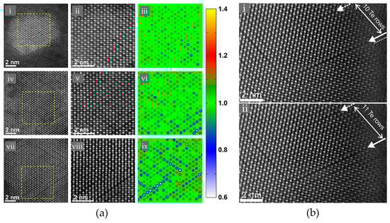 Figure 7. (a) The HAADF-STEM images of rocksalt Ge2Sb2Te5 annealed at 150 °C for 2 min (i–iii), 160 °C for 30 min (iv–vi), and 180 °C for 30 min (vii–ix). The zoom-in views and the corresponding normalization maps (only the cation-like atomic columns were considered) of the boxed regions in (i), (iv) and (vii) are shown in (ii–iii), (v–vi) and (viii–ix), respectively; (b) The MAADF-STEM images of rocksalt Ge2Sb2Te5 under focused electron beam irradiation. The movement of a vacancy-rich cation-like layer was observed and was marked by the arrows in (i) and (ii). Adapted with permission from References [42,92]. © 2016 American Institute of Physics; 2016 Elsevier Ltd.