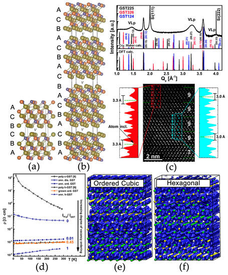 Figure 8. (a,b) The atomic structure of hexagonal and ordered cubic Ge2Sb2Te5. The stacking sequence of Te layers is labelled with A, B and C; (c) The XRD curve and HAADF-STEM image of ordered cubic Ge2Sb2Te5 grown by MBE method. “Vacancy layers” (VLs) appear every 7–9 atomic layers, marked by dashed green lines. The cubic and hexagonal stacking coexists in this MBE grown sample, boxed by red and cyan dashed lines; (d) Resistivity as a function of temperature for epitaxial and sputtered GST samples. Empty and filled squares denote the disordered rocksalt phase and ordered cubic phase, while triangles denote the hexagonal phase; (e,f) Are snapshots of the HOMO state of the ordered cubic and hexagonal GST. Chemical disorder Ge/Sb on the cation-like layers is included for both models. Adapted with permission from References [12,15,71,93] © 2008 American Physical Society; 2011, 2012, 2016 Nature Publishing Group.