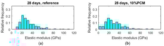In Figure 12, histograms of measured elastic modulus for 28-day old pastes with various percentages of PCM inclusions are given. As the percentage of PCM microcapsules increases it can be seen that histograms shift towards lower elastic modulus values. Although PCM microcapsules at the specimen surface are likely to be damaged during the specimen preparation procedure, the moduli reduced with PCM inclusion percentage increase. This is because nanoindentation is a volumetric measurement: a test will sample the material under the indenter up to a certain depth depending on different factors, as shown by [26]. Since MIP measurement showed no significant increase in porosity of the paste phase, this is most probably the reason.