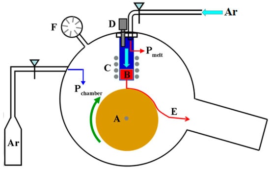 Schematic illustration of the melt-spinning process installed an infrared thermometer. (A): Cu wheel; (B): melt; (C): induction heater coil; (D): infrared thermometer; (E): ribbon; (F): vacuum meter.