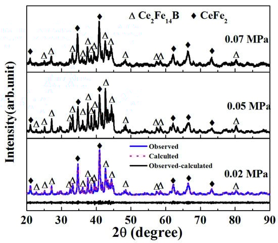 X-ray diffraction patterns of Ce17Fe78B6 ribbons prepared at a constant wheel speed of 15 m·s−1, but at chamber pressures of 0.02, 0.05 and 0.07 MPa.
