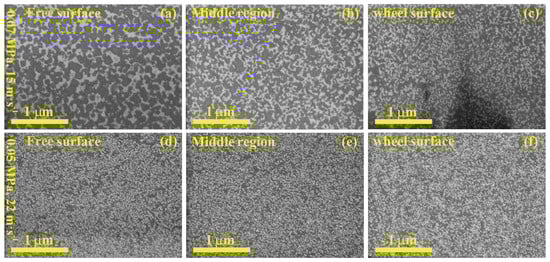 Samples P7-15 and W5-22, which exhibited exactly the same volume fraction of Ce2Fe14B and CeFe2, had similar magnetic properties (see Table 1), suggesting similar microstructures. This was confirmed by cross-sectional back-scattered SEM images (Figure 4). In sample P7-15, the grain size of both phases decreased from the free surface to the wheel surface (that is, the surface in contact with the copper wheel) (Figure 4a–c). Both phases were distributed uniformly. For sample W5-22, two phases with smaller grain size had a uniform distribution from the free surface to the wheel surface (Figure 4d–f). These TEM results indicate that chamber pressure and wheel speed may not be completely independent. Several different combinations may result in similar microstructure and magnetic properties.