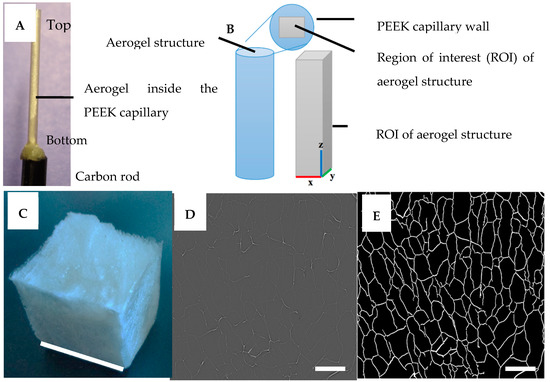 (A) Formation of aerogels inside the polyether-ether-ketone (PEEK) capillary (Diameter: 0.8175 mm); (B) Graphical representation of the selected region of interest (ROI) of the aerogel structure to omit the PEEK capillary wall; (C) Cubical aerogel; (D) Tomographic image from the Tomographic Microscopy and Coherent Radiology Experiments (TOMCAT) scan of a xyloglucan (XG) aerogel; and (E) after binarization of image D. The scale bar in C is 17 mm, and in D and E is 100 μm. PEEK = Polyether ether ketone.