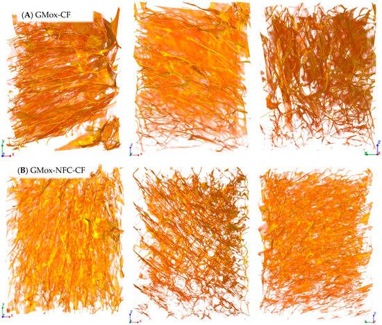 The purpose of adding a reinforcing agent to the composite material is to enhance the latter’s mechanical properties. The compatibility and interaction of the reinforcing agent with the polymer are imperative to achieve a high-performance composite material. To locate NFC in the GMox and XGox matrices, we used phase-enhanced XMT for scanning aerogel samples. However, visualizing NFC in the 3D structure was difficult due to the similar attenuation of X-rays by NFC and the matrix polysaccharides. Therefore, we did not distinguish NFC from the biocomposite aerogel structure. In earlier studies, Sedighi-Gilani et al. reported that XMT successfully revealed NFC in the NFC-silica hybrid aerogel because of difference in the attenuation of the X-ray energy of NFC and silica [31].