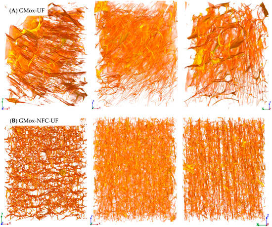 When unidirectional freezing was used as an ice-templating method, the GMox-UF and GMox-NFC-UF samples showed a structure oriented in the direction of freezing (Figure 3A,B). The oriented structure as a function of the direction of the freezing was more prominent in the GMox-NFC-UF sample (Figure 3B). Irrespective of the pore size, the samples were mostly connected to form nodular channels parallel to one another in the direction of the freezing. The cell structures were anisotropic in the form of buttresses and exhibited smaller pore sizes compared to those of GMox-UF (Figure 3A). Please see the detailed 3D structure of conventional and unidirectional ice-templated GMox samples in XMT Video S1, Video S2, Video S3, and Video S4 in the supplementary data.
