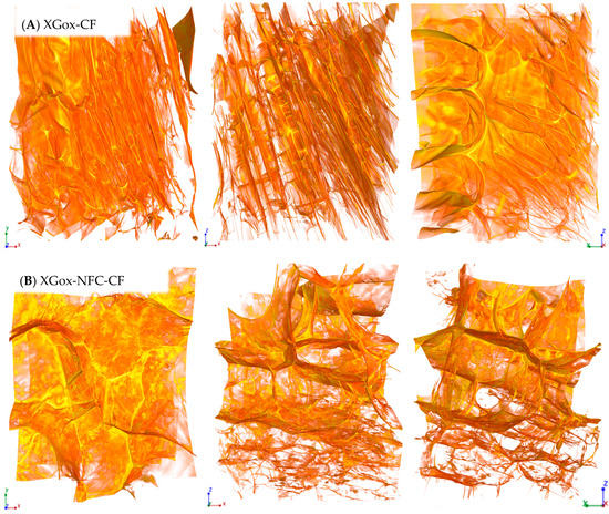 Three-dimensional reconstructed images from synchrotron phase contrast microtomography of (A) oxidized XG (XGox) aerogel and (B) aerogel reinforced with 25%NFC (XGox-NFC), prepared by conventional freezing (CF). The size is 495.33 × 495.33 × 660.33 μm3 in XYZ-axis.