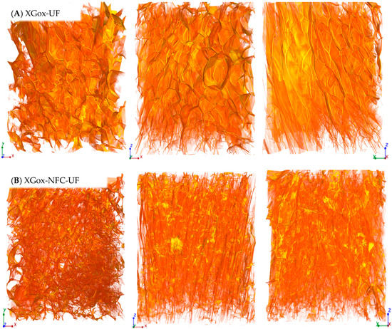 Three-dimensional reconstructed images from synchrotron phase contrast microtomography of (A) oxidized XG (XGox) aerogel and (B) aerogel reinforced with 25% NFC (XGox-NFC), prepared by unidirectional freezing (UF) using liquid nitrogen. The size is 495.33 × 495.33 × 660.33 μm3 in XYZ-axis.