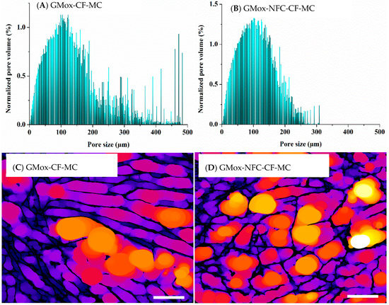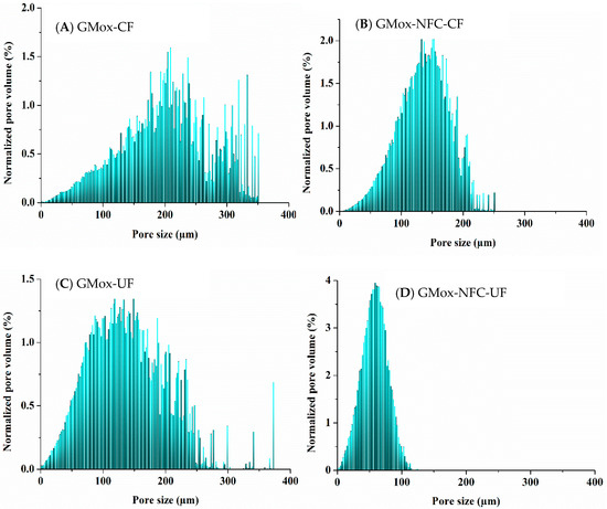 Volume-weighted pore-size distribution of (A) GMox and (B) GMox reinforced with NFC using the conventional freezing (CF) method. Volume-weighted pore-size distribution of (C) GMox and (D) GMox reinforced with NFC prepared by the unidirectional freezing (UF) method.