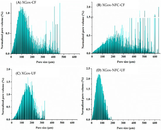 Volume-weighted pore-size distribution of (A) XGox and (B) XGox reinforced with NFC using the conventional freezing (CF) method. Volume-weighted pore-size distribution of (C) XGox and (D) XGox reinforced with NFC prepared by the unidirectional freezing (UF) method.