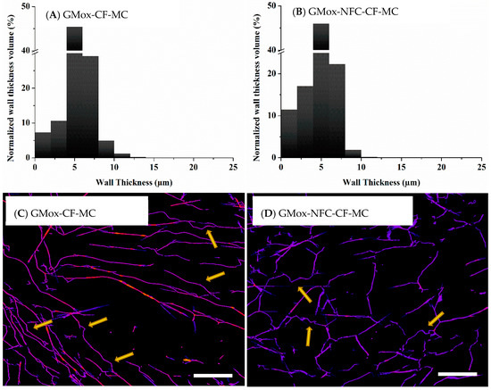 Volume-weighted pore-wall thickness distribution of (A) GMox and (B) GMox-NFC. Segmented middle slice (s1080/2160) from the local thickness map of (C) GMox and (D) GMox-NFC for pore-wall thickness distribution. Aerogels were prepared by the conventional freezing (CF) method. MC = mechanically compressed. The scale bar in C and D is 100 μm. Arrows indicate the observed buckling effect.