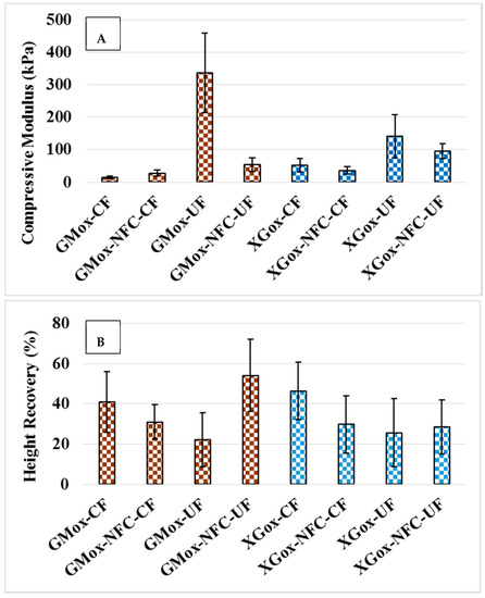 (A) Compressive modulus and (B) height recovery after the compression testing of the aerogels. GM = guar galactomannan, XG = tamarind xyloglucan, ox = oxidized, NFC = nanofibrillated cellulose, CF = conventional freezing, UF = unidirectional freezing.