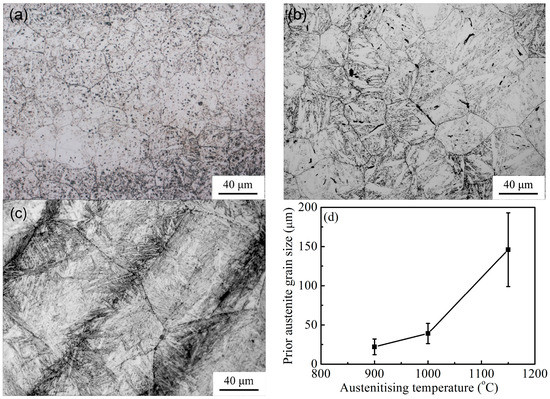 Figure 1a–c show the typical OM images of prior austenite grains in samples austenitised at 900 °C, 1000 °C, and 1150 °C, respectively. The dependence of prior austenite grain on austenitising temperature is demonstrated in Figure 1d. The mean size of prior austenite grains increased with austenitising temperature, and the grain size became extremely large as austenitising temperature reached 1150 °C.
