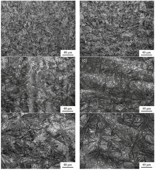 Figure 2 reveals typical OM microstructures of samples isothermally transformed at 220 °C and 260 °C at austenitising temperatures of 900 °C, 1000 °C, and 1150 °C. The black or dark grey needles are bainite, and white blocks are retained austenite in all isothermally transformed samples. No undissolved carbides are observed, and this is consistent with the results of XRD patterns. The packet size and needle length were measured by Image-Pro Plus software. The size of the packet in Figure 2a–e is ~7 ± 1, 9 ± 2, 14 ± 2, 18 ± 4, 24 ± 6, and 27± 9 μm, respectively. The length of the needle in Figure 2a–e is ~11 ± 2, 18 ± 4, 26 ± 5, 29 ± 7, 41 ± 12, and 42 ± 14 μm, respectively. The packet size and needle length—rather than thickness—of bainite markedly increased with austenitising temperature. Increasing the isothermal transformation temperature mainly resulted in increased thickness of bainite needles, rather than in the packet size and the needle length. This phenomenon is attributed to the fact that the austenite grain size is greater at high austenitising temperature. This characteristic reduces the density of nucleation sites of bainitic ferrite, increasing the packet size and the needle length. As we all know, at lower isothermal transformation temperature, the transformation driving force or degree of supercooling is larger, thereby increasing the nucleation rate of bainite and thinning the bainite needles. The fraction of blocky retained austenite was measured by the Image-Pro Plus software, and that in Figure 2a–e is ~8.3%, 9.1%, 11.1%, 13.3%, 12.5%, and 15.4%, respectively. Therefore, the size and fraction of blocky retained austenite increases with isothermal transformation and austenitising temperatures (Figure 2). Higher austenitising temperature leads to increased blocky austenite [16]. Retained austenite occurs in two forms in nanostructured bainitic steels. The blocky austenite is trapped between different bainite packets, and film-like austenite is trapped between bainitic ferrite laths.