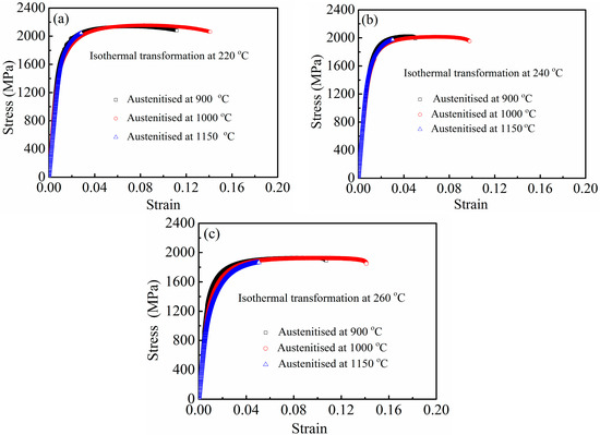 Engineering stress-strain curves of samples isothermally transformed at (a) 220 °C; (b) 240 °C; and (c) 260 °C after austenitisation at different temperatures.