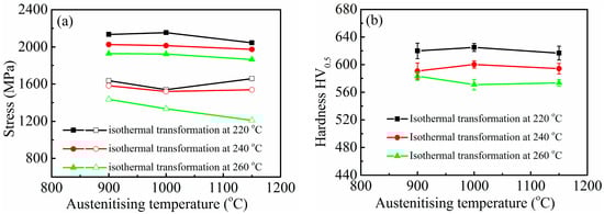 Novel nanostructured bainitic steels are designed to form nanostructures consisting of 20–40-nm-thick plates of bainitic ferrite and retained austenite by low-temperature isothermal bainite transformation [1,2,3]. The nanostructure presents an excellent combination of strength (ultimate tensile strength (UTS) of ~2.5 GPa) and toughness (up to 40 MPa·m1/2) [4,5]. These nanostructured bainitic steels are typically composed of high C, high Si, and a mass of austenite stabilizer (such as Mn and Cr) to ensure low-temperature isothermal bainite transformation without carbide precipitation. This process requires an isothermal transformation time as long as several to tens of days. Expensive elements such as Co or Co + Al are added in steel to accelerate bainitic transformation [6,7]. Nanostructured bainitic steel with high hardness is developed by increasing C content, decreasing Cr content, and removing Mn [7]. Moreover, bainitic transformation is accelerated by reducing C, Mn, Cr, and Mo contents and by refining prior austenite grain size with Nb addition [8,9]. This process can also be accelerated by increasing Si content to 3 wt % and reducing Mn and Cr contents [10], instead of adding Co and Al. In addition, Huang et al. [11] proposed a new low-Mn high-Cr nanostructured bainitic steel with increased hardness. The formation of low-temperature bainite was effectively promoted by considerably reducing Mn content and adding a small amount of Al. Most studies are focused on alloy design and the effect of heat treatment—in particular, isothermal transformation temperature—on microstructure and mechanical properties of nanostructured bainitic steels. Xu et al. [12] recently reported that higher austenitisation temperature can remarkably accelerate isothermal bainitic transformation in medium-C superbainite steel. Wu et al. [13] and Kong et al. [14] revealed that coarse austenite grain size obtained by austenitising at high temperature can accelerate isothermal bainitic transformation of high-C superbainitic steel. Wu et al. [13] also found that coarse austenite grain increases the width and length of bainitic ferrite sheaves in high-C superbainitic steel. Hence, mechanical properties are inevitably affected by austenitising temperature. This work was performed to evaluate the effect of austenitising temperature on microstructure and mechanical properties of high-C nanostructured bainitic steel.