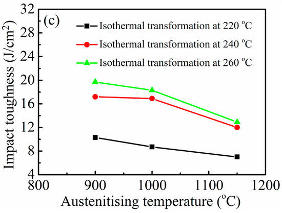 Figure 7 shows the SEM fractographs of impact samples isothermally transformed at 260 °C after austenitisation at 900 °C and 1150 °C. The fracture morphologies display cleavage facets, tearing ridges, and ductile dimples, suggesting that the fracture is in a mixed mode of ductile and brittle phases. The low-magnification SEM fractographs in Figure 7a,b show that the fracture surface roughness of sample austenitised at 1150 °C is less than that of the sample austenitised at 900 °C. Additionally, the high-magnification SEM fractographs in Figure 7c,d illustrate that cleavage facet size in the fracture surface of sample austenitised at 1150 °C is larger than that of sample austenitised at 900 °C. Therefore, high austenitising temperature leads to low impact toughness.