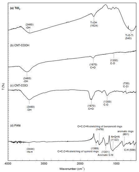 The Fourier transform infrared spectroscopy (FTIR) spectra of base materials for immobilized photocatalysts. (a) TiO2; (b) Carbon nanotubes (CNT)-COOH; (c) CNT-COCl; (d) Polyaniline (PANi).