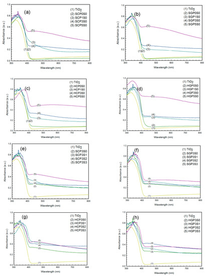 The UV-Vis absorption spectra of immobilized photocatalysts. (a–d) Effect of PANi on SCPS, SGPS, HCPS, and HGPS photocatalysts (no sodium dodecyl sulfate (SDS)); (e–h) Effect of SDS on SCP3S, SGP3S, HCP3S, and HGP3S photocatalysts.