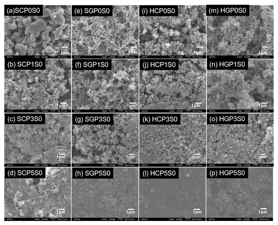 The UV-Vis spectra of PANi-CNT/TiO2 photocatalysts are shown in Figure 2. The characteristic adsorption wavelength of TiO2 was determined at 387 nm. For CNT/TiO2 photocatalysts, the characteristic wavelength increased to 392–413 nm for the SCP0S0, SGP0S0, HCP0S0, and HGP0S0 photocatalysts, as shown in Figure 2a–d. This finding may be due to the functional group of C=O on CNT-COOH and CNT-COCl, shown in Figure 1b,c, being excited when adsorbing a light source greater than 400 nm. In addition to PANi increasing from 1–5%, the adsorption edge shifted from 421 to 423 nm, 415 to 440 nm, 403 to 417 nm, and 416 to 442 nm for the SCPS (Figure 2a), SGPS (Figure 2b), HCPS (Figure 2c), and HGPS (Figure 2d) series photocatalysts. The PANi could adsorb light with a wavelength greater than 490 nm [29], and consequently showed a distinguished red-shift effect of the adsorption edge for the PANi-CNT/TiO2 photocatalysts. The most distinguished red-shift of the adsorption edge was found for the SGPS and HGPS series photocatalysts.