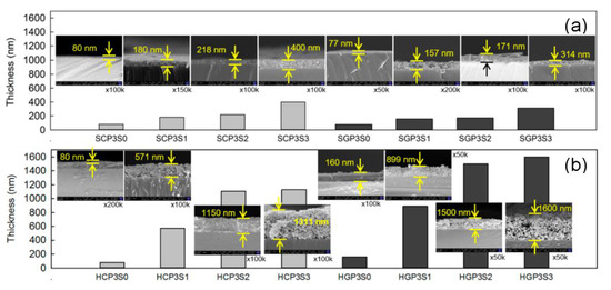 The addition of SDS into PANi-CNT/TiO2 photocatalysts would modify the hydrophobic characteristic of the photocatalysts and result in a thicker coating film. The thicker doping film will extend the transferring path of electrons, which favors photo-degradation performance; however, the thicker doping film will be easily detached. Hence, the optimal amount of SDS additive was the key factor for preparing good PANi-CNT/TiO2 photocatalysts. The results of the coating film thickness for the SCPS/SGPS photocatalysts and the HCPS/HGPS photocatalysts are shown in Figure 6a,b, respectively. The coating film thickness for the SCPS and SGPS photocatalysts was only 80 nm and 77 nm, respectively, with no addition of SDS. With the addition of 1–3 cmc of SDS, the coating film thickness increased to 180–400 nm for the SCPS photocatalysts and 157–314 nm for the SGPS photocatalysts, respectively. For the hydrothermal synthesis of photocatalysts with no addition of SDS, the coating film thickness was 188 nm and 160 nm for the HCPS and HGPS photocatalysts, respectively, which was 2.1–2.4 times greater than the SCPS/SGPS photocatalysts. With the addition of 1–3 cmc of SDS, the coating film thickness increased to 571–1105 nm for the HCPS photocatalysts and 889–1600 nm for the HGPS photocatalysts, which were 5.1–5.7 times greater than the coating film thickness of the SCPS/SGPS photocatalysts. This revealed that the PANi-CNT/TiO2 photocatalysts prepared with acyl chloride grafted CNT (CNT-COCl) by hydrothermal synthesis in this study exhibited a thicker coating film than SCPS/SGPS photocatalysts. Furthermore, the thickness of the coating film was positively correlated with SDS concentration. This may be largely due to the various preparation methods of the photocatalysts. The SCPS/SGPS photocatalysts were prepared using sol-gel hydrolysis at a high temperature and resulted in the extra dopant being removed by the centrifuge process. However, the HCPS/HGPS photocatalysts were prepared under a lower temperature, a higher pressure, and a longer aging time. The SDS plays an important role in linking between PANi polymers; this results in a thicker coating film, which agreed with Katoch et al. [54].