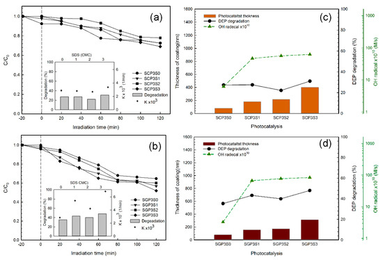 The hydroxyl radicals are a strong oxidizing species subject to the degradation of organic pollutants [28]. The graphs in Figure 7c,d illustrate the correlation between DEP degradation and the hydroxyl radical generation rate, as well as coating film thickness for the SCPS and SGPS series photocatalysts. A positive correlation was found between DEP degradation and coating film thickness. A thicker coating film would inhibit the recombination of electrons and electron-holes due to the extension of the electron’s transferring path, which resulted in the enhancement of photo-catalytic activity. Furthermore, an increase of film thickness also increases the amount of TiO2 and the area of the reaction field for photo-catalytic decomposition as judged from the porous structure in Figure 3. All these factors should contribute to the photo-catalytic decomposition. With the SDS concentration increased to 3 cmc, the hydroxyl radicals’ generation rate increased greatly, from 6.2 × 10−10 to 6.4 × 10−9 M/s for SCPS photocatalysts and from 3.3 × 10−10 to 8.3 × 10−9 M/s for SGPS photocatalysts. The DEP degradation was also positively correlated with the hydroxyl radical generation rate, except for SCP3S2 and SGP3S2. Jiménez et al. [40] reported that the defect sites easily accumulated electrons and promoted their attachment on O2 to produce powerful superoxide radicals (O2−•) in the photo-catalytic system. The superoxide radicals (O2−•) might be another key oxidant to degrade DEP for SCP3S2 and SGP3S2. In the investigated systems, the hydroxyl radical generation rate and the coating film thickness may be considered for the evaluation of the catalytic activity of photocatalysts.