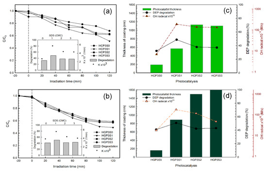 (a,b) Photo-degradation of DEP by hydrothermally-synthesized photocatalysts ([DEP]0 = 1 mg/L; pH = 7;λ = 410 nm; I = 40 mW/cm2; Irradiation time = 120 min); (c,d) Photo-degradation efficiency of DEP by hydrothermally-synthesized photocatalysts vs. hydroxyl radical generation and coating film thickness.