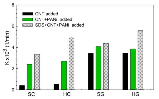 The contribution of CNT, PANi and SDS to the photo-catalytic activity of surfactant modified PANi-CNT/TiO2 prepared in this study irradiated with 410 nm is shown in Figure 9. The results showed that, with addition of PANi, the reaction rate constants of SC and HC photocatalysts increased from 0.41 10−3 1/min to 2.4 10−3 1/min and from 0.57 10−3 1/min to 2.70 10−3 1/min, respectively, which showed that 4.8–5.9 times of photocatalytic activity were enhanced. For SG and HG photocatalysts, only 1.1–1.2 times of reaction rates were increased. With the addition of SDS, 1.4–1.8 time and 1.1–1.4 time of photocatalytic ativity was increased for hydrothermally-synthersized photocatalysts (HC and HG) and sol-gel-synthesized photocatalysts (SC and SG), respectively. For sol-gel-synthesized photocatalysts, both PANi and SDS were important to enhance the photo-catalytic acticity, whereas, for hydrotermally-synthesized photocatalysts, the contribution of SDS to photocatalytic activity was more critical.