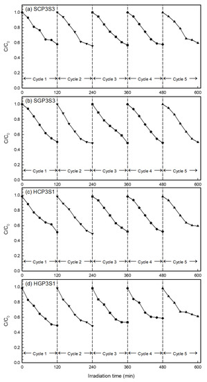 The cyclic runs of the photo-degradation of DEP with immobilized surfactant-modified PANi/CNT/TiO2 photocatalysts were conducted to evaluate their photo-catalytic stability and recyclability. The four investigated photocatalysts were repeatedly tested up to five times; the results of which are shown in Figure 10. The five-cycle repeated photo-catalytic degradation efficiency of DEP for SCP3S3 was 42.1%, 44.2%, 43.2%, 42.2% and 40.3%, respectively. This showed that the degradation efficiency for SCP3S3 was only 1.8% less after being used five times. For SGP3S3, the five-cycle repeated photo-catalytic degradation efficiency of DEP was 49.8%, 51.5%, 51.1%,50.9% and 50.0%, respectively, which showed that the degradation efficiency of DEP at the fifth cycle was similar to that at the first cycle. For HCP3S1, the five-cycle repeated photo-catalytic degradation efficiency of DEP was 48.7%, 50.7%, 47.9%, 47.9% and 40.5%. This showed the degradation efficiency for HCP3S3 was 8.3% less after being used for five cycles. For HGP3S1, the five-cycle repeated photo-catalytic degradation efficiency of DEP was 50.8%, 51.5%, 46.6%, 41.3% and 38.7%. Compared to the other three photocatalysts, the degradation efficiency for HGP3S3 after being used for five cycles was significantly decreased. The results in Figure 10 illustrated that the photo-catalytic performance at the first cycle for all photocatalysts was not superior to those of the other subsequent uses. This agreed quite well with Hung et al. [18] and Sriwong et al. [55], who reported that the surface of the photocatalyst was covered with trace impurities when freshly prepared. The photo-catalytic activity of all immobilized photocatalysts were stable for at least five cycles.