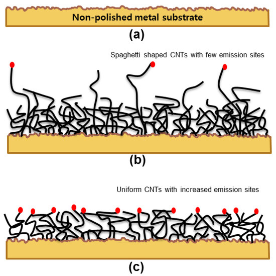 Figure 1b shows the expected result of growth process. Generally, the CNTs grown on metal substrate has few electron-emitting sites because of the non-uniform heights of CNTs. In these conditions, the tip of taller CNT filaments only act as the emission site during FE [20]. Thus, to increase the emission sites and to enhance and stabilize the FE over a wide current range, the FE measurement is done by electrical aging treatment process [21]. The electrical aging treatment increases the emission sites by making the height of CNTs over a metal substrate uniform. We performed the repeatable FE measurement for 50 cycles to apply an electrical aging effect on the emitter. Figure 1c shows the expected result of electrical aging treatment. To measure the stable FE of CNT emitters, 50 more repeated cycles were performed. The FE properties of the CNT emitters were measured in the e-gun test chamber with triode configuration and base pressure maintained at 3.0 × 10−7 Torr. Figure 2b shows the triode configuration during field emission test. The triode configuration was preferred to avoid the module problems, such as anode melting and arcing effect between gate and cathode. Spellman SL300 (Spellman High Voltage Electronics Corporation, New York, NY, USA) was chosen to measure anode current and as an anode voltage source. Anode voltage of all field emission measurements were obtained below 8 kV. For gate voltage source and gate current measurement, the Stanford research PS350 (Stanford Research Systems, CA, USA) was used. For the cathode current measurement, Keithley 6485 (Keithley Instruments, Inc., OH, USA) was installed between the emitters and the ground. The gap between the mesh and the anode was maintained at 370 μm.