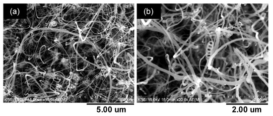 The morphology and quality of the CNTs were analyzed using field emission scanning electron microscope (SEM, Hitachi SU-70, Hitachi High-Technologies Corporation, Tokyo, Japan). The CNTs sample were sputtered-coated in Pt for 1 min before taking SEM images.