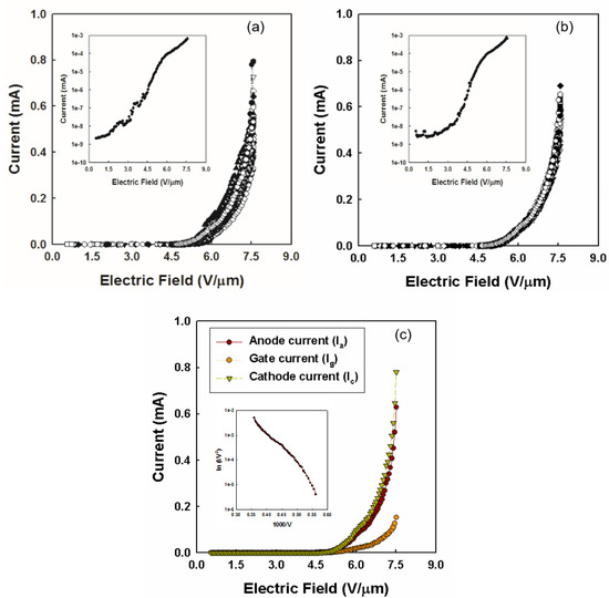 Table 1 shows the change in the stability of FE over the cycles at operational voltages and electric fields for X-ray imaging. This table further confirms the result of electrical aging treatment. During the 1st–50th Cycles, the standard deviation (S.D.) of anode current and relative standard deviation (R.S.D.), i.e., the percentage of ratio between S.D. and average current, were observed to be high. This data signifies that the FE during this cycle was unstable. However, during the 51st–100th Cycles, the S.D. and R.S.D decreased producing stabilized FE. For example, the S.D./R.S.D. from the 1st–50th Cycles to the 51st–100th Cycles at electric field of 7.6 V/µm decreased by almost 2 times. One thing that should not be forgotten is that there was no degradation of anode current over the cycles. This result also confirms the stability of anode current over the cycles. From the inset graphs of Figure 4a,b (i.e., the semi log plot FE of cathode current at 50th and 100th cycle, respectively) it can be observed that the turn-on electric field of CNT emitters was 4.5 V/µm. Figure 4c shows the FE graph at the 100th cycle and inset shows the FE phenomena by linearity of Fowler Nordhiem plot [22]. The cathode current of approximately 0.78 mA and anode current of 0.63 mA was obtained at a gate electric field of 7.51 V/µm. The anode current was measured by adjusting the gate electrode in the dc mode. The leakage current ratio was below 20%.