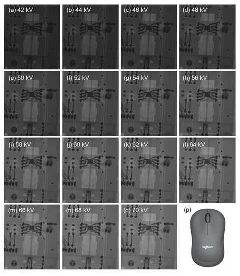 (a–o) X-ray images and (p) the optical image of computer mouse with accelerated energies 42–70 kV.