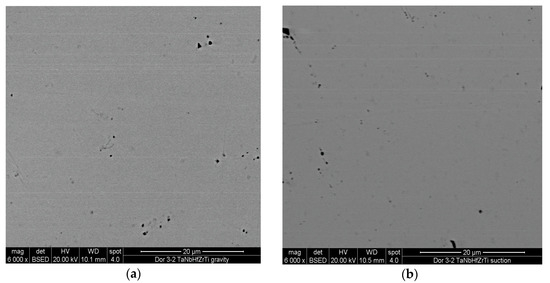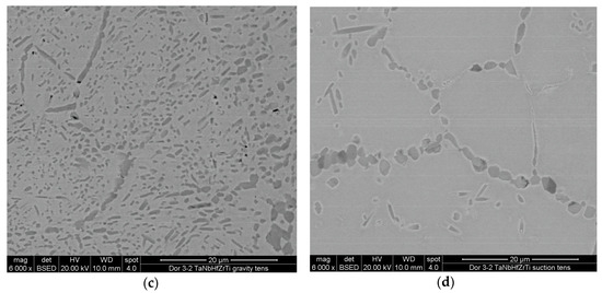 Figure 1a depicts a back-scattered SEM image of the gravity-cast material prior to HIP, while Figure 1b shows the suction-assisted casting. Figure 1c,d depict the back-scattered SEM images of these two castings after HIP. Note that both materials were single phased before undergoing HIP, while a darker phase is discernible inside the bright matrix after HIP. Table 1 provides the respective Energy Dispersive X-ray Spectroscopy (EDS) analyses. It should be noted that the dark phase is evenly dispersed in the matrix of the gravity-assisted casting, while in the case of the suction-assisted casting it is concentrated mostly at the grain boundaries.
