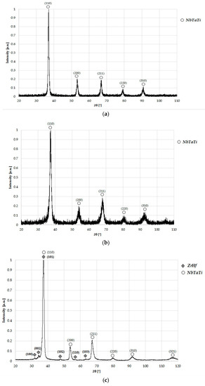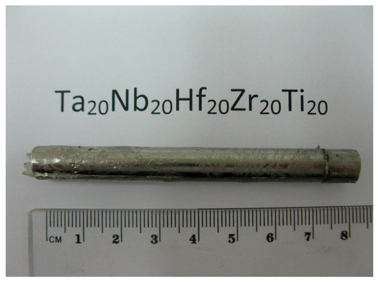 As reported by Senkov et al. [2,3], the process of producing the Ta20Nb20Hf20Zr20Ti20 alloy consisted of vacuum arc melting followed by re-melting the material three times, five minutes each time, in order to achieve homogeneity. After that, the material underwent Hot Isostatic Pressing (HIP) at 1200 °C and 207 MPa for 1 h and finally underwent vacuum annealing at 1200 °C for 24 h.