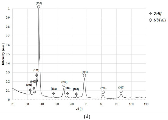 XRD spectra of both the gravity and the suction-assisted cast samples before HIP (see Figure 2a,b respectively) correspond to single-phase NbTaTi-based BCC material. The chemical compositions of the considered samples correspond to an overall equi-atomic material composition (see Table 1). Based on the above described SEM study, which indicates the presence of two major phases in the case of the HfNbTaTiZr alloy that has undergone HIP, each peak was associated with one of these two phases: a roughly equimolar solid solution of ZrHf and a solid solution of NbTaTi, again at roughly equimolar proportions. As ZrHf solid solution phase is comprised of HCP elements (at room temperature), it has an HCP structure and thus exhibits the characteristic X-ray diffraction pattern of other HCP phases. Contrary to the ZrHf, the NbTaTi solid solution phase is comprised of BCC elements and therefore has a characteristic X-ray diffraction pattern of other BCC-structured substances. Figure 2c shows the XRD spectra of the gravity-cast HfNbTaTiZr alloy and the HCP/BCC designation of each peak, while Figure 2d shows the spectrum of the suction-assisted cast, both after HIP.