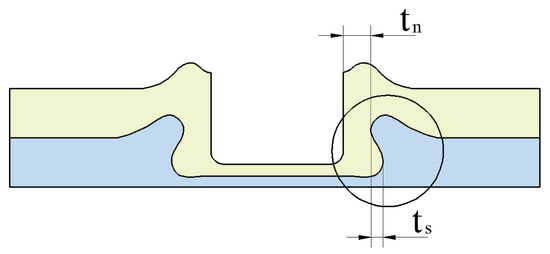 The improved clinched joint is produced using mechanical processes. Thus, the joining quality of the improved clinched joint mainly depends on the geometrical parameters of the joint profile other than the process-induced strain hardening and mechanical properties of the material [50]. As shown in Figure 2, the main geometrical parameters include the interlock (ts) and neck thickness (tn).