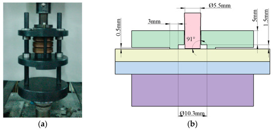 As shown in Figure 6a, the specimen used for the tensile test was placed as a cross-shaped type. The improved clinched joint was also located on the center of the metal sheets. A pair of special tensile testing fixtures was designed to measure the tensile strength, as shown in Figure 6b. The lower sheet was fixed by the lower fixture, and the upper sheet was pulled by the upper fixture to move upward until the joint was failed.