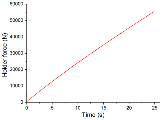 The mechanical improved clinching process was also carried out on the Instron 5982 machine (Instron Company, Grove City, PA, USA). The clinching tools for the improved clinched joint are shown in Figure 3. The main clinching tools include a punch, a flat anvil, and a blank holder. Different forming forces such as 40, 50, 60, 70, 80, and 90 kN were applied in the improved clinching process to produce different clinched joints. The speed of the punch in the clinching process was 0.5 mm/s. The blank holder was connected to the punch by disc springs. Disc springs were also used to generate holder force on the blank holder. The holder force on the blank holder was shown in Figure 4. The preload of the blank holder was set to 500 N.