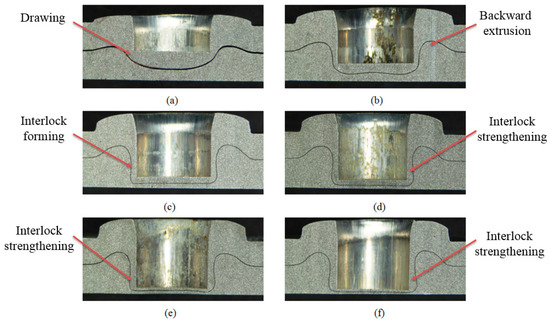 The cross-sectional profile of the improved clinched joint is directly influenced by the evolution of material flow during the mechanical improved clinching process [53]. A series of cross-sectional profiles of improved clinched joints is shown in Figure 7 to display material flow for forming an improved clinched joint.